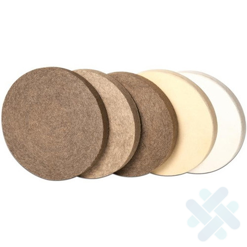 Круги изготовлены из 100% овечьей шерсти (мытое сырье) темного цвета в соответствии с требованиями ГОСТ. Технические параметры стандартного ассортимента: толщина 40-55 мм, плотность до 0,48 г/см3. Диаметр 300-500 мм.
